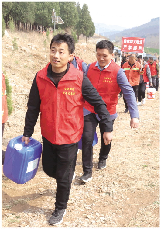 3月18日,在临朐县冶源街道,志愿者把装满水的水桶运到山上的储水点。当日,“拎水上山”行动志愿服务活动在冶源街道回头村附近的山林举行。临朐县按照每500亩林地设置20个储水点、每个点不少于150升储备消防用水、每个护林员配备1套简易水枪的标准,推广“拎水上山”工程。 潍坊日报社全媒体记者 付生 通讯员 刘明志 刘瑞华