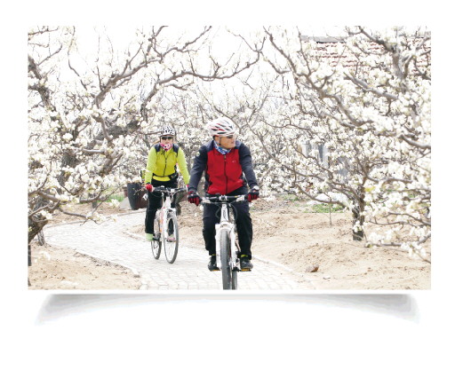 昌邑博陆山风景区,骑行爱好者在盛开的梨花中穿行。