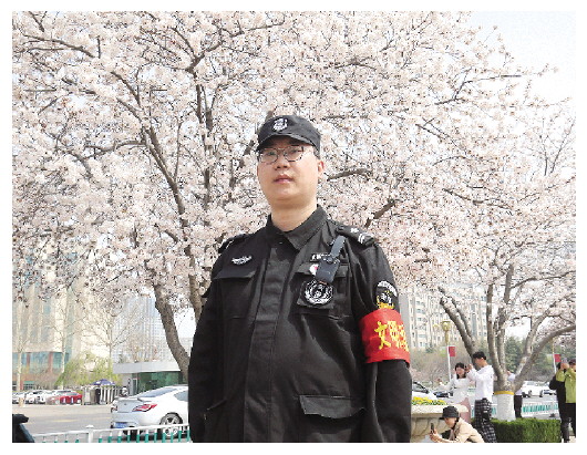 本报讯(潍坊日报社全媒体记者 赵春晖)3月28日,在市人民广场樱花树下,身穿黑色保安制服、胳膊上套着“文明劝导”红袖章的保安吕浩然,出现在记者张驰的镜头里。身材挺拔的吕浩然站在樱花树下,整个人精气神十足,与身后的绚烂樱花相得益彰。