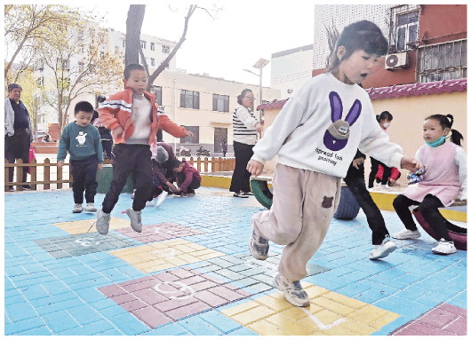 日前,潍城区城关街道增福堂社区在广场上用彩色地砖设置了经典老游戏“跳房子”区域,不仅能锻炼孩子们跳跃、奔跑和保持身体平衡的能力,还能培养他们的团结、协作意识,吸引了众多孩童前来体验。 潍坊日报社全媒体记者 张驰