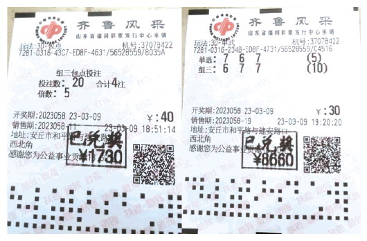 “潍坊福彩”订阅号二维码 3月树木新绿、春意正浓,到处鸟语花香、生机勃勃,潍坊彩友们也热情高涨,中奖喜讯接连不断。 安丘彩友多种方法玩转3D,斩奖96990元 3月9日,福彩3D游戏第2023058期开奖号码为“7、6、7”,安丘彩友马先生(化姓)在37078422号福彩站通过单选、组选、包点三种方式投注,共中得奖金96990元。 俗话说:“九层之台,起于垒土。”马先生作为一名资深彩友,不仅把购买福利彩票当作自己的一种娱乐方式,而且每次购彩时都会根据自身条件保持理性消费,凭借着不断积累的购彩经验,他在3D选号方面也有了自己一套独到的见解。 这天晚饭过后,马先生像往常一样来到站点,他对照走势图研究片刻后,首先预测当期可能会出组三,而且和值可能是偏大的“20”点,然后便对组三包“20”点进行5倍投注。在确定了和值“20”后,马先生又开始分析每一位的号码走势,最终确定了“7、6、7”这组号码,于是又进行了单选5倍、组选10倍的投注。号码选定后,马先生对这组号码越看越喜欢,就和销售员讨论了起来,在得到销售员的肯定后,马先生觉得“7、6、7”就是他当天的幸运号码,便果断对该组号码进行了单选50倍、组选100倍的投注。 当期开奖,马先生通过这套组合投注成功斩获奖金96990元。马先生直言:“这次中奖既是经验的积累,也是碰上了好运气,希望好运能够延续,助力自己继续斩获大奖。” 春暖花开,临朐彩友3D获奖16465元 3月22日,福彩3D游戏第2023071期开奖号码为“2、9、5”,位于临朐县城创新路与朐山路交叉口的37070504号福彩站又传来彩友中奖的喜讯,彩友李先生(化姓)中得当期15注单选和5注组选,共计获奖16465元。 据了解,李先生一直热衷研究号码走势,每天都会来站购买3D,在投注时每次都是固定5注单选和5注组选相结合,因为他觉得组选就是为了不错失奖金而准备的保障,所以每次投注都会外加几注组选。这次,李先生经过仔细筛选,最终确定了百位“2”、十位“9”、个位“5”,出票时甚至把单选多打了10倍,组选还是原先的5倍保持不变,然而就是这组号码让李先生命中当期3D开奖号码,喜获奖金16465元。 在分享中奖心得时李先生说道:“看走势分析和投注技巧固然重要,但玩彩票的好心态必不可少,这样才能天天都有一份好心情,享受福彩带给自己的乐趣,中不中奖我都乐在其中。” 春意正浓,相约福彩,赶紧来收获属于你的那份幸运吧! (潍坊福彩 林浩 窦金鑫)