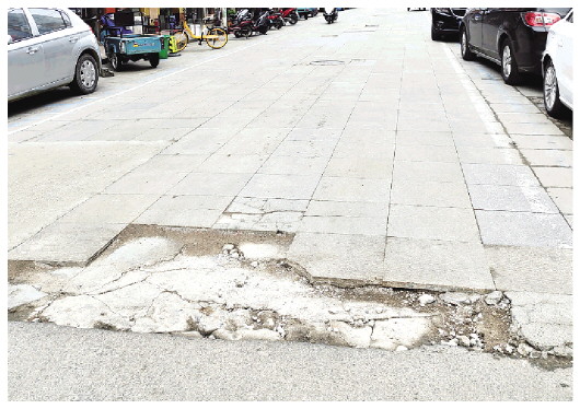 通济门街地面砖缺失,路面坑洼不平。