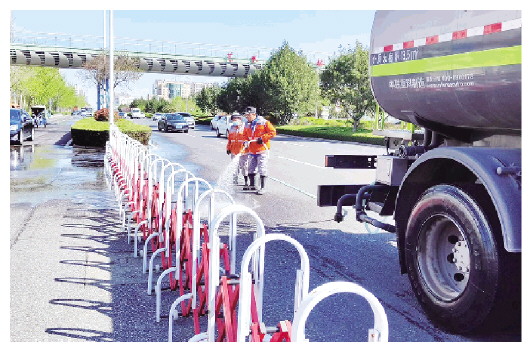 4月8日,在城区北海路上,环卫工人正趁天气晴好,采取机械清洗与人工作业紧密结合的方式,为景观大道“洗澡”,将道路标线和路牙石上的尘土和污渍清理得干干净净。冲洗过后的北海路焕然一新,为市民营造了干净整洁的城市环境。 潍坊日报社全媒体记者 赵春晖