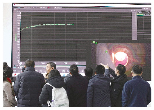 1月14日,在位于安徽省合肥市的聚变堆主机关键系统综合研究设施(CRAFT)园区内,科研人员及专家通过大屏幕了解强流直线等离子体装置“赤霄”的运行状态。每平方米每秒钟可极速喷射出亿亿亿个粒子!记者从中国科学院合肥物质科学研究院获悉,该院大科学团队成功研制强流直线等离子体装置“赤霄”,如同一把性能超强的“激光剑”,为研制“人造太阳”核心材料提供科技利器,14日经专家组鉴定,“赤霄”参数达到设计指标,整体性能国际先进。 新华社发