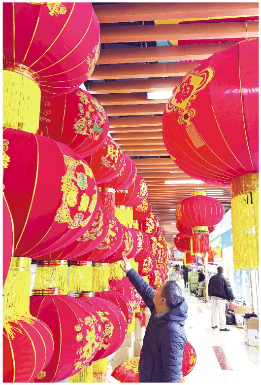 1月16日,在潍坊商品城,市民在选购大红灯笼。随着春节临近,各式各样的大红灯笼被高高挂在了商铺最显眼的位置,十分亮眼。商家告诉记者,传统款式的大红灯笼进入热销期。 本报记者 张驰