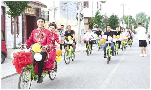 本报讯(记者 隋炜凤)7月4日,青州市黄楼街道西建德村上演了一场别开生面的浪漫之旅。新郎李长松与新娘郑明明身着喜服骑着双人自行车在前,后面跟随由10辆公共自行车组成的迎新车队(上图),在亲友的祝福与路人的掌声中,他们开启幸福旅程。