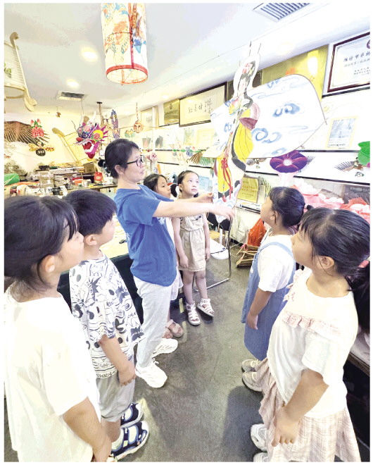 7月8日,在城区十笏园非遗空间,孩子们正在学习潍坊风筝的制作。当日,潍城区城关街道曹家巷社区开展了“暑假学非遗”活动,组织孩子们来到十笏园非遗空间,学习了解潍坊风筝、木版年画、剪纸、面塑等非遗项目的制作工艺,让孩子们感受非遗的魅力,丰富暑假生活。 本报记者 张驰