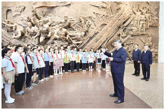 在纪念馆大厅,习近平同前来参观的青少年学生和纪念馆工作人员亲切交流。他说,88年前的今天发生的“七七事变”,是中华民族全面抗击日本侵略者的起点,前事不忘、后事之师,到这里来就是接受精神洗礼。广大青少年生逢其时,要赓续红色血脉,树立强国有我的远大志向,做堂堂正正、光荣自豪的中国人,勇担民族复兴的时代大任。