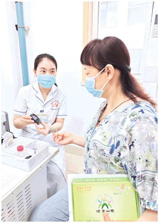 7月9日,在坊子区人民医院,一名就诊者在“健康体重管理医防融合门诊”测血糖。据了解,我市在坊子区等县市区先行先试开展“体重管理双‘医’靠 医防融合‘潍’健康”工作。一位患者,两位医生,疾病诊疗与健康教育双管齐下,为市民提供双“医”靠的一体化健康管理服务。 本报记者 郭超 宋寿爽