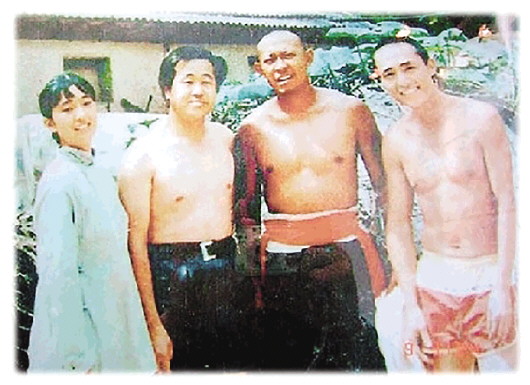 电影《红高粱》拍摄花絮照,从左到右:巩俐、莫言、姜文、张艺谋。
