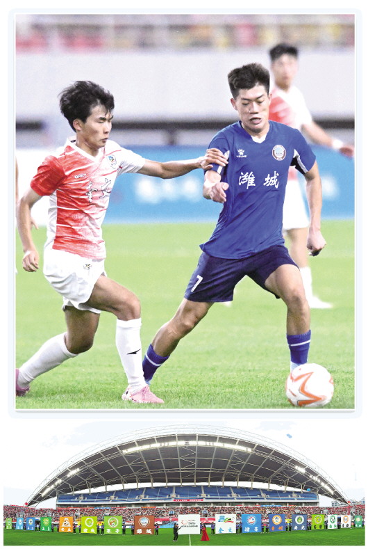 7月12日晚,“好运山东 悦动潍坊”——潍坊市首届足球超级杯赛(简称“V超”)开幕式在潍坊奥体公园体育场举行。在当晚举行的揭幕战中,主场作战的潍城队以3∶1战胜奎文队,取得开门红。 上图:潍城队队员(右)与奎文队队员在比赛中激烈拼抢。 本报记者 王晓光 下图:在“V超”开幕式上,16支代表队队旗一字排开。 本报记者 杨小凡
