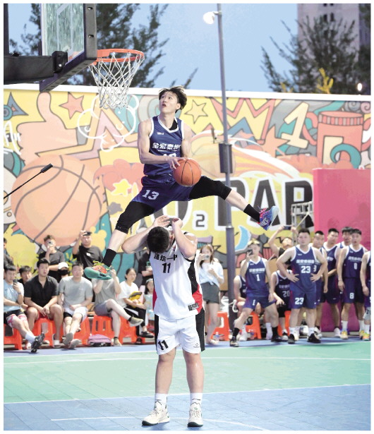 7月13日晚,潍坊市第五届体育旅游季潍坊篮球城市超级联赛2025赛季暨奎文区第八届全民健身篮球联赛,在新辰天地室外篮球场启幕。赛事会聚全市20支顶尖篮球俱乐部球队、近500名精英篮球运动员,将在2个多月时间里上演近100场高水准对决。图为比赛中场休息时,运动员进行扣篮表演。 本报记者 付东升 通讯员 邵光远