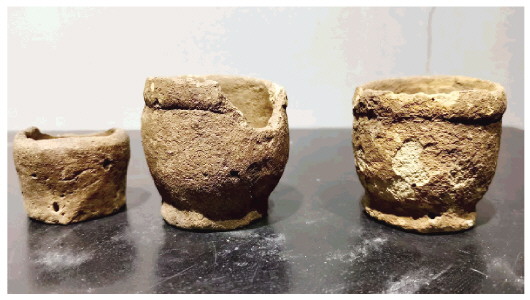 20多年前,王雍阁在寒亭区朱里街道(原朱里镇)前埠下村附近一处集市的地摊上,偶然发现了这三件红陶筒形残器,珍藏至今。王雍阁与文物专家经过反复考究,确定它们是后李文化前埠下遗址遗存。三件文物采用红泥捏制法制作,形状大小单手可握,颇像现代人饮酒酒器。表面绳纹细密,制作工艺精湛,凝聚着先民智慧和巧思。历经岁月侵蚀,三件文物虽然出现了残损,但器身却沉淀出一种残缺美。