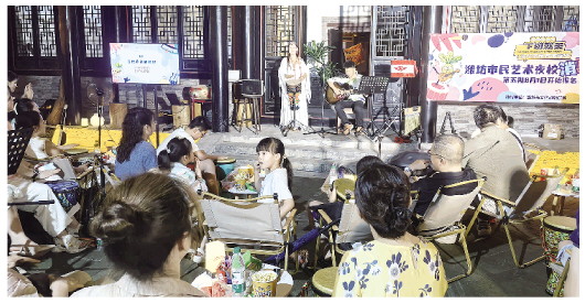 本报讯(记者 刘燕)7月23日晚,潍坊市民艺术夜校消夏音乐趴在潍城区松园子古民居热闹开演,一场融合手碟、吉他、非洲鼓、中阮、陶笛、琵琶、古琴等多元乐器的音乐盛宴,为市民带来别样的夏夜清凉与艺术享受。