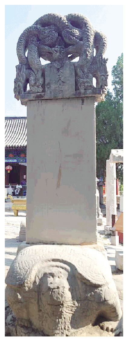 该碑立于昊天宫院内殿前正中位置,碑石采用驼山优质青石,其奇特之处在于碑首与碑身为整石雕成,碑首龙形,气势雄浑,雕凿精细。碑身高200厘米,宽100厘米,厚27厘米;龙形碑首高95厘米,宽130厘米。碑文共137字,用行楷书写。