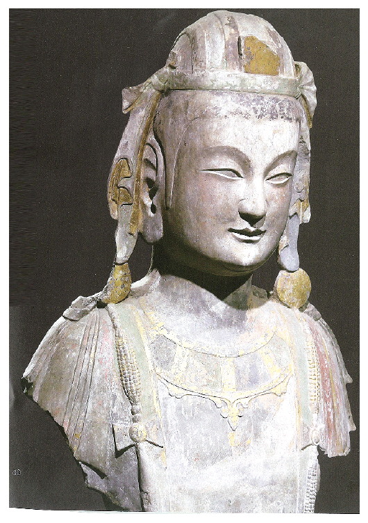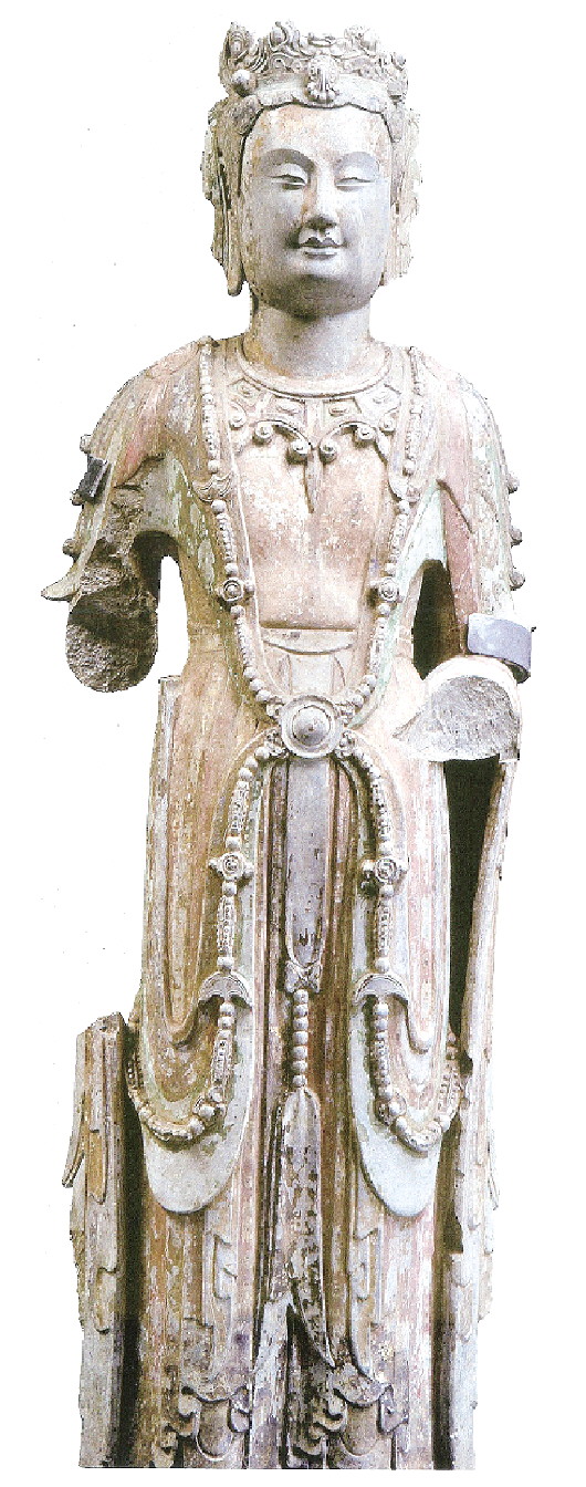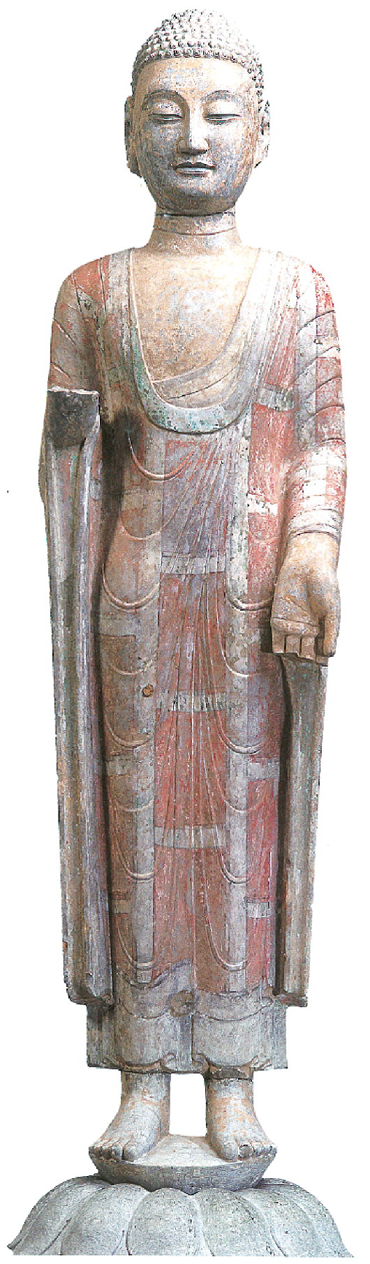 东魏贴金彩绘菩萨立像(资料图片) 北齐贴金彩绘佛立像(资料图片) 北齐至隋贴金菩萨立像(资料图片) 北齐贴金彩绘思惟菩萨像(资料图片) 龙兴寺始建于北魏时期,是一处延续近千年的著名佛教寺院。窖藏坑位于寺院遗址的最北部,南北长8.7米、东西宽6.8米,坑内有规律地埋藏有北魏、东魏、北齐至隋、唐、北宋时期的石灰石、汉白玉、花岗岩、陶、铁、木及泥塑等各类佛教造像400余尊。其中最大的高320厘米,最小的仅高20厘米。造像雕刻技巧高超,包括圆雕、浮雕、镂雕、线刻、贴金、彩绘等多种技法。龙兴寺佛教窖藏造像群是迄今中国发现的数量最多的佛教造像群。湮没的龙兴寺遗址上出土佛教窖藏造像群 1996年10月,青州师范学校在实施操场扩建改造工程时,发现了一处埋藏地下千年之久的佛教窖藏造像遗址,出土了北魏至北宋年间的各类佛教造像400余尊。 青州,自古就是佛教兴盛之地,寺院文化十分丰富。据史书记载,早在西晋太安二年(303),青州即建有宁福寺。南燕慕容德推崇佛教,建有多所寺院;刘裕破南燕后,刺史刘善明在此建佛堂;到北魏、北齐时期,建南阳寺,历名长乐寺、大云寺等,唐玄宗开元年间,始称龙兴寺。 自唐朝末期武宗灭佛,历经宋、金、元三代的龙兴寺开始衰落,但仍是天下名刹。明朝初年,朱元璋封自己儿子朱榑为齐王,拓地建齐王府,龙兴寺湮没。 龙兴寺出土的佛教造像具有明确刻铭者400余尊,有北魏永安二年(529)与北宋天圣四年(1026)的作品。时间跨度近500年,而以北魏、北齐时代的为主;造像的材料以石雕为主。其数量之大,跨代之久,种类之全,雕凿之精,贴金彩绘之完好,在我国佛教考古中实属罕见,被学术界称为“改写东方艺术史的重大发现”。这些造像神态逼真,形态各异,或深思,或凝视,或禅定,或说法,佛教哲学的全部思想和智慧,通过这些精美的造像展现了出来。特别是施以贴金彩绘之后,更加显得神圣端庄、华丽高雅,令人叹为观止。青州龙兴寺佛教造像精品先后在北京、上海以及美国、日本、英国、德国、瑞士展出,引起了国内外的轰动。 龙兴寺窖藏造像,从种类上分,主要有背屏式佛三尊像、圆雕式单体佛造像、单体圆雕菩萨造像等。背屏式佛造像众多体现青州独特风格 龙兴寺出土的背屏式佛造像数量众多,保存完整的有数十件,高的达305厘米,小的仅50厘米左右,以北魏、东魏、北齐时期为主,部分带有题刻,标有明确年份。 这批背屏式造像,雕凿艺术极具特色,体现了古代青州地区独特的造像风格。造像背屏顶部多为飞天和火焰纹,个别有翔龙,还有彩绘及阴线刻出的火焰纹和莲花。主体造像有的为一尊,有的为三尊或五尊,三尊最多,五尊较少。主尊多为彩绘佛立像,像作高肉髻,面相较长,嘴角含笑,内着僧祗支,外披褒衣博带式袈裟,头后莲花项光。佛像面部贴金,朱唇,红色袈裟,项光、背光皆彩绘。左右胁侍菩萨,亦为圆形顶光,中有双层莲瓣装饰;戴冠,宝缯上扬,冠前有主要饰件;额前梳五个圆形发辫饰,黑发从耳后分左右两股,自肩部垂至臂侧,呈上下两层。两肩之上有圆形发卡饰件,饰件下有彩带飘至腰间。菩萨面部清秀,长眉棱角清晰,眼微睁,如弯月,嘴角上翘,呈微笑状,双耳下垂。颈佩项圈,项圈下雕忍冬花纹佩饰,帔帛从两肩下垂,在身前缠绕至腿部后,左右交叉,上卷至双肘间,然后再飘然下垂。菩萨上身袒露,或穿斜衽内衫,下着长裙,裙结系于腹部,裙下摆外移,并多层重叠,跣足立于莲台上。造像的主形冠饰件、发卡饰件,项圈上贴金。服饰以朱红、孔雀蓝、石绿等彩绘,发涂黑色。主尊和两侧胁侍间,下部刻有翔龙,龙嘴吐出水柱,水柱顶端为莲茎、莲花、莲叶等,托出胁侍所立之莲台。圆雕式单体佛造像风格变化较为鲜明 龙兴寺的圆雕佛单体造像,鲜明地体现了从秀骨清像到丰满圆润的风格变化。青州龙兴寺窖藏出土的佛像,主要集中在北魏末年至北齐时期,其中尤以东魏、北齐时期的造像居多,而且最为重要。北魏末年到东魏,是青州佛教的大发展时期。这时的石雕佛教艺术作品,可以说最能反映地区的差异。此时,青州地区佛像肉髻为细且高的形状,这种细高形的髻在佛像头顶极为突出。这种高髻,再配上螺纹、图涡纹、波浪纹等发饰和孔雀蓝的彩绘,使其头饰极为特殊。佛像的面目清瘦,弯眉,丹凤眼半睁,鼻呈蒜头状,小嘴上翘,双耳下垂,这一切,将那亲切自然的面容刻画得栩栩如生,永远微笑着面对世间,宛如有什么话要对人们讲述。 北齐佛像基本上为圆雕。从这一时期的200余尊单体圆雕佛像分析,可以归纳出两种类型:一类是身上有凸棱垂纹袈裟的佛像,它们面部较长,额部较平,眼微睁,鼻上部略凹,鼻梁平直,颧骨较高。袈裟垂纹成二行下垂,在下身显出双腿。另一类是穿浅线袈裟的佛像,身上无任何线条,仅有肢体突出部位表现其身材,这种雕琢技法,为北齐时期我国佛教造像雕刻的一种标准式样,而这种式样的佛头像,多为面部呈圆形,头顶部略尖,额较宽,鼻梁从额中直下并略带弧形,双眼微睁,颧骨较矮,嘴较小,下颌较突出,双耳下垂,窄且长,五官较为集中。 青州龙兴寺佛教造像诸佛的面孔,带着矜持而又深邃的微笑,没有愤怒,没有痛苦,没有轻蔑,甚至看不到悲悯。他们颌首垂眉,双目微闭,无视万物,却洞悉人情世态,唯留无言微笑与众生。 无论谁站在佛像面前抬眼凝视时,都会被那纯净的笑容所打动…… 青州佛像神秘的微