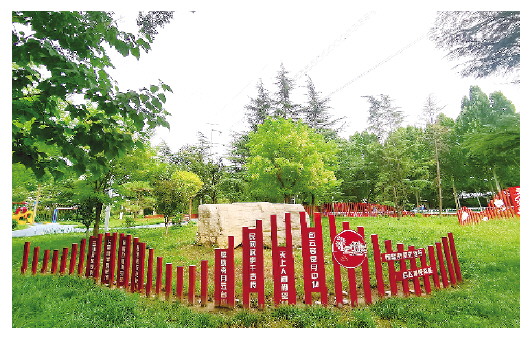 绿地内还有一片设计巧妙的红色造型格栅(上图),不仅美观,还具备展示功能,将年画、风筝、神话传说等地域文化、人文元素融入其上,将寒亭的人文底蕴展现得淋漓尽致。此外,诸多造型各异的大型景观石点缀于绿地之中,同样为绿地增色不少。