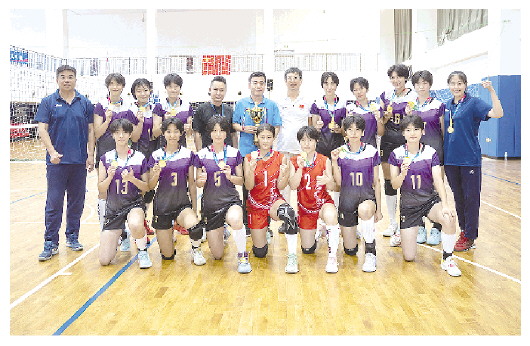 张芮嘉(后排右五)、刘丽娟(前排右四)和队友教练夺冠后合影。