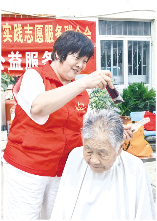 7月30日,志愿者在为退役军人家属理发。在“八一”建军节来临之际,为弘扬拥军优属光荣传统,当日,潍坊尚德公益服务中心的志愿者来到奎文区东关街道院校街社区开展“军民鱼水情·双拥暖人心”志愿服务活动。志愿者向退役军人致以节日祝福和诚挚问候,并为退役军人及其家属进行义剪、义诊等贴心服务,一幕幕暖心互动的场景令人动容。 本报记者 刘晓梅