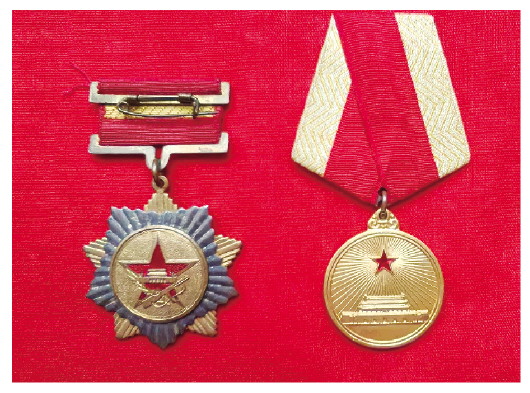 粘文焕(左三)在五莲县卫生局工作时与同事留影。 粘文焕(前排右一)在昌北炮兵靶场时与同事合影。 粘文焕所获奖章和纪念章 到达朝鲜后,粘文焕所在的后勤医院驻扎在一个山沟的军营里,在庆贺李主任喜得千金的酒席上,粘文焕听曲参谋长讲述亲身经历的朝鲜战场,很受触动。回国后,粘文焕先在昌北炮兵靶场工作,后转业到昌潍地区最偏远的贫困山区五莲县工作。1986年全家又搬回了潍坊。帮助朝鲜恢复建设庆祝李主任得千金 到达朝鲜后,我们炮兵B师编为志愿军序列,师部和后勤医院驻扎在离平壤约几十公里的一个山沟的军营里。周边有几个朝鲜村庄组成的农村合作社。经过战后几年的建设,军营的设施虽不如国内,相对也比较完善。几个炮团分散在周围,对平壤形成拱卫之势。战后我国对朝鲜进行了无私援助。我留守的二十几万志愿军部队在保卫朝鲜的同时,也积极地投入到朝鲜的经济和基础建设中。他们帮助朝鲜修复被战争破坏的公路、铁路、桥梁和水坝,还建起大量医院、学校、办公大楼等。听二次入朝的同志讲,战时美军的轰炸机把成千上万吨炸弹倾泻在面积仅有60平方公里的平壤市区。美国飞机的狂轰滥炸,不但杀伤了数以万计的平壤居民,而且使平壤市的建筑遭到毁灭性的破坏,没有一座完整无损的建筑物,几乎完全变成了瓦砾堆。我们在平壤停留时,看到平壤的建设已基本恢复,工厂、商店、学校、医院还有公交,人们的脸上充满了喜悦,一派欣欣向荣的景象。 4月初,积雪消融,朝鲜的春天还是姗姗来迟,李主任送来妻子生产的消息,是个女孩,整八斤重。我们相约下班后到李主任和爱人的媒人——陆副政委的宿舍庆祝一下。 “来,都坐下。小粘打开我存的茅台。”陆副政委说。李主任和陆副政委是老战友,也是胶东老乡。陆副政委宿舍的桌上摆了拼凑起来的六个菜。中间一大盆猪肉炖干山蘑菇,边上四小盆是土豆烧肉、白菜炒粉条子,还开了两个铁皮罐头。这个时候新鲜蔬菜是没有的。我们各倒了半茶缸酒。曲参谋长回忆作战情景 举杯致敬志愿军烈士 “一起庆祝李主任喜得千金!”陆副政委举杯说。“好!干!”曲参谋长一大口酒已下肚。一个多小时后,两瓶酒已快见底。酒喝到一定时候,曲参谋长说:“俺来了!俺又来了!俺来看俺的弟兄们!”曲参谋长红着眼睛,但绝没有醉。“一来我就去了志愿军烈士墓,这里一个合葬大墓,埋着我的老部队几百个战友。他们在我营炮火的掩护下,英勇地占领了阵地,把敌人赶了下去。正当他们阻击溃逃的敌人时,美国飞机来了,投下了大量凝固汽油弹,阵地上一片火海。但没有一个后退的!战后我们看到他们有的躯体几乎烧化了,但和枪熔在了一起。有的冒着火,抱住冲上来的美国鬼子一起烧死!还有一个小号手,他的躯体还算完整,身上中弹倒下的,烧得变了形的小手还紧紧地握着那号角!他是迎着敌人的子弹在吹号,冲锋号!”曲参谋长说。我们都泪流满面。曲参谋长猛地站起身来,端起斟满酒的茶缸,脚步依然稳健。他打开门,夜晚初春的凉风涌了进来。他把茶缸里的酒迎着风尽力扬向空中,脸仰望夜空,繁星满天。李主任说:“朝鲜的金达莱,再有一个月就开放了。在咱们老家叫映山红,现在已经开得漫山遍野了。这是最美丽的山花,这是最英雄的山花,这是最红最红的山花。我的女儿就叫李映红!”“好!你的女儿叫李映红,小粘的女儿叫粘新红,都是咱革命的后代。咱们打仗,咱们牺牲,都是为了和平,都是为了中朝人民的幸福。来,为和平干杯!”我们随着陆副政委站起来,把杯中酒一饮而尽。 1958年4月末,当金达莱又一次盛开的时候,志愿军开始奉命回国。我师在首批回国之列。战士们一起认真打扫了驻地的营房内外,按照上级指示,除了武器装备,将其他物资完好地交给了朝鲜军队。 回国当天,我们早早启程,悄悄地走,希望不要打扰到朝鲜百姓。但朝鲜百姓早就在营房外等着我们了,他们给我们塞着鸡蛋、年糕和他们自己都舍不得吃的东西。大家都眼泪汪汪,依依不舍。他们追着炮车、军车奔跑着,呼喊着。转业后全家搬到五莲任管帅中心医院院长 1973年深秋,我被调到位于昌潍平原的济南军区炮兵射击场工作。昌北炮兵靶场近200平方公里,是一块盐碱滩。场部大院营房小,来演练的部队都住在盐碱滩上临时搭起的军用帐篷里,淡水要从几十公里外的县城拉,条件的确艰苦。“天上是风沙,地上是野草,五级不算风,炒菜不用盐”是真实的写照。在演练中常有受伤或生病的干部、战士,卫生所的工作是繁忙的,我在这里工作了4年。 1978年秋,我转业到昌潍地区最偏远的贫困山区五莲县工作。 五莲县因位于莲花山下而得名。这里山清水秀,民风淳朴。妻子被安排在县医院工作,我们的家也安在这里。本来我被安排在县卫生局工作,除县医院外,全县仅有三处中心医院,分布在几个较大的公社驻地。领导征求我的意见,说管帅中心医院没有院长,书记在主持工作,问我能不能先去干两年院长,把医疗业务搞起来。我爽快地同意了。其实,一来到五莲县我就发现,这里的干部外地人居多,特别是胶东的和军转干部多。“五莲县城三个灯,一个喇叭全城听。你倒好,连三个灯的县城也待不下,你都50岁了,到管帅好几十里山路呢。”妻子抱怨说。我也听说过这个顺口溜,笑了笑。儿子却说:“我们学校可好呢。”这所学校叫五莲县实验学校,是