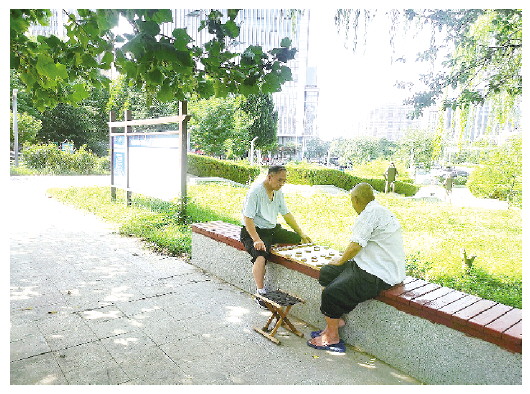 沿着台阶拾级而上,是公园的休闲广场,广场四周有大量绿地,其上栽种着不少高大树木,树荫遮蔽下,形成一块块清凉空间。长条座椅上,居民悠闲地下棋、聊天、遛娃,惬意之感油然而生。休闲广场两侧的林荫道上,设置有各式各样的健身器材,可供游人在此休闲锻炼。公园一角,设有一处大型的篮球场,不少市民在此打球运动,享受健康生活。
