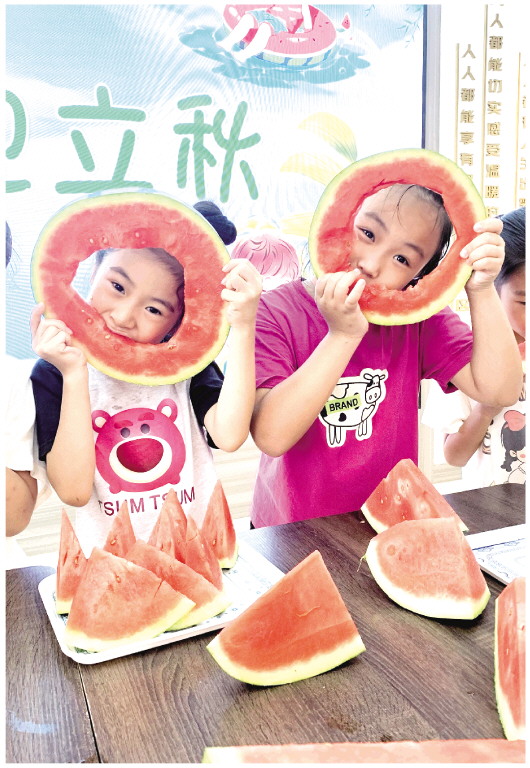 8月6日,在潍城区城关街道增福堂社区,孩子们在“啃秋”。8月7日迎来立秋节气,民间有在立秋之日“啃秋”吃西瓜的习俗。当日,该社区开展了一场“‘啃秋’迎立秋 民俗入童心”活动,通过讲解立秋习俗、举行吃西瓜比赛等形式表达“啃下酷夏,迎接秋爽”的祈愿,带领孩子们体验传统民俗,了解二十四节气。 本报记者 张驰