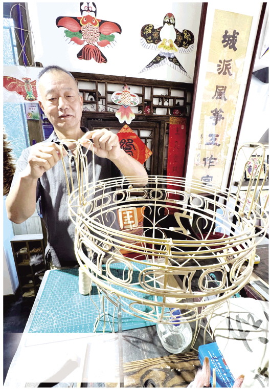 8月18日,潍坊城区十笏园文化街区风筝艺人李松的工作室内,李松正在对“毛公鼎”风筝骨架进行调整。据了解,毛公鼎是西周晚期青铜礼器,高53.8厘米,腹深27.2厘米,口径47厘米。李松采用立体骨架风筝造型方式,历时三个多月按照1∶1的比例扎制,工艺精益求精,令人赞叹。 本报记者 张驰