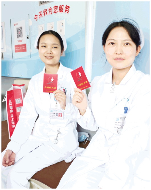 8月19日是第八个中国医师节,节日主题是“德馨于行 技精于勤”。8月16日、17日,潍坊市人民医院组织医务人员开展了一场无偿献血活动。平日里手持手术刀、听诊器的“白衣天使”,纷纷撸起袖子化身“热血守护者”,用汩汩热血诠释“医者仁心”。在为期两天的献血活动中,共有354位医务人员奉献热血。图为护士刘文静(右)、王海霞展示无偿献血证。 本报记者 王路欣 通讯员 刘玉华
