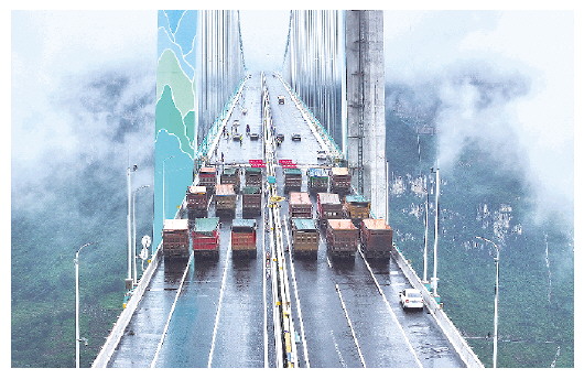 8月21日拍摄的贵州花江峡谷大桥荷载试验现场(无人机照片)。8月21日,在建世界第一高桥——贵州花江峡谷大桥正式启动荷载试验。2022年开工建设的花江峡谷大桥,跨越被誉为“地球裂缝”的花江大峡谷,是贵州省六枝至安龙高速公路的控制性工程。大桥为钢桁梁悬索桥,全长2890米,其中主桥跨径1420米,桥面至水面高度625米。 新华社发