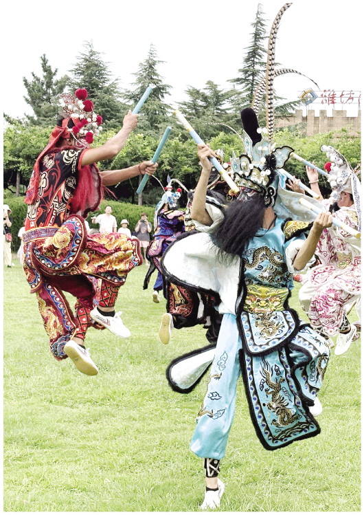 8月23日,在城区金宝乐园,精彩的英歌舞表演吸引了游客目光。当日,一场非遗英歌舞表演活动在这里举行,来自广东潮汕地区的23名英歌舞演出者伴随着快速而有韵律的节奏,迈出欢腾的步伐,手中舞槌上下翻飞,在空中划出一道道优美的弧线,豪迈之气破阵而出。据了解,英歌舞是广东潮汕地区的传统民俗舞蹈,又被称为“中华战舞”,2006年入选首批国家级非物质文化遗产名录。 本报记者 张驰 通讯员 郭丹