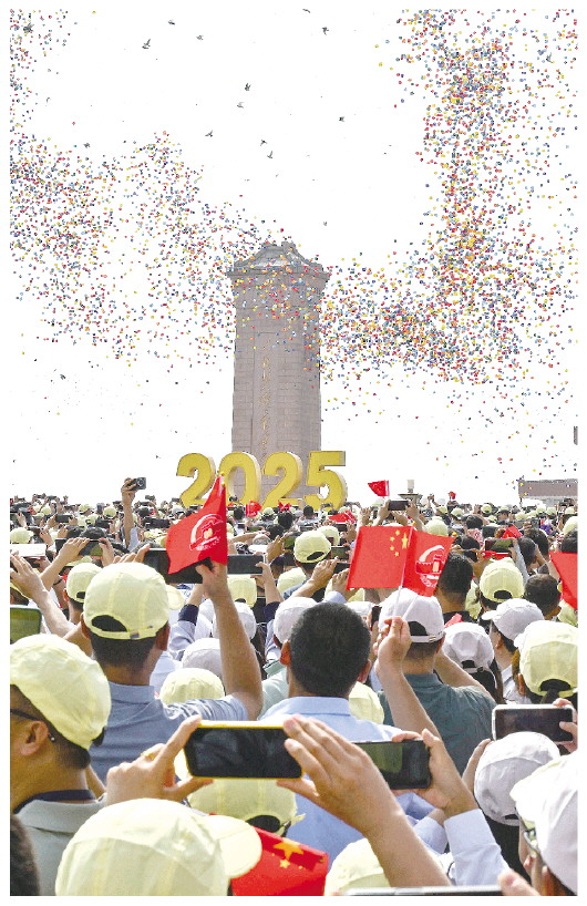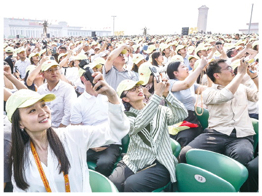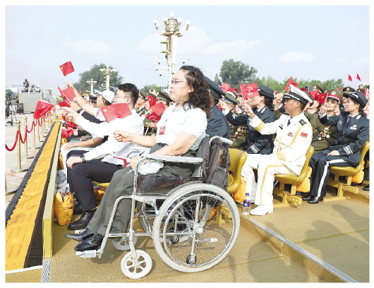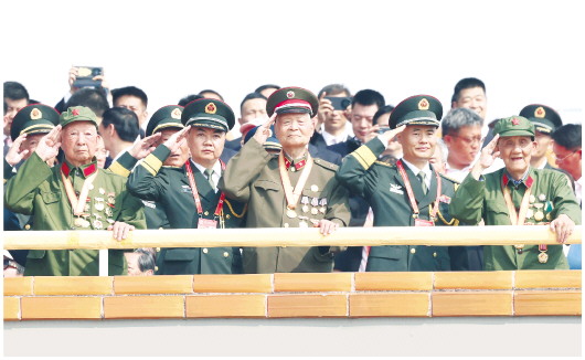 观礼的老战士起身敬军礼。 纪念大会放飞气球和鸽子,观礼嘉宾拍照留念。 观礼嘉宾纷纷拍照。 纪念大会的观礼嘉宾。 9月3日上午,纪念中国人民抗日战争暨世界反法西斯战争胜利80周年大会在北京天安门广场举行。观礼嘉宾中,不乏来自各地的抗战老战士、抗战烈士亲属、烈士遗属、全国最美拥军人物,也有各行各业的优秀工作者代表,他们共同见证这一伟大的历史时刻。 当一个个整齐的受阅方阵从天安门广场昂首经过,当先进的武器装备精彩亮相,不少坐在观礼席上的抗战老战士起身敬军礼。他们举起的右手或许有点颤颤巍巍,但他们的军礼郑重而又标准;他们的身躯或许不再挺拔,但他们的眼神依旧充满坚毅。本版文图均据新华社