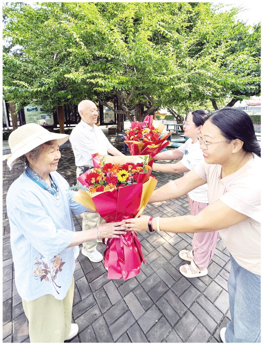 9月9日,在潍城区城关街道曹家巷社区,退休老教师们收到了教师节鲜花。当日,该社区开展了一场“鲜花送‘园丁’ 致敬社区退休老教师”活动,社区工作人员准备好教师节鲜花送到辖区内部分退休老教师的手中,向他们致以节日的问候。 本报记者 张驰
