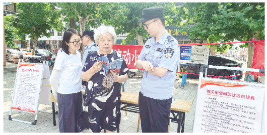 “高空抛物要担责?”“物业费怎么交才合法?”在颐园小区广场的“流动小铺”前,居民们围在“社区微法典”展板旁热烈讨论。工作人员指着漫画图解,讲解民法典要点,现场还设置了互动游戏,居民王大爷答对3道题目后,开心地领到了定制法治环保袋。