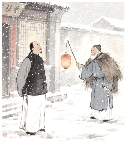 迷路的“鹞子画师”站在雪夜中,一名老秀才挑着灯笼走来。