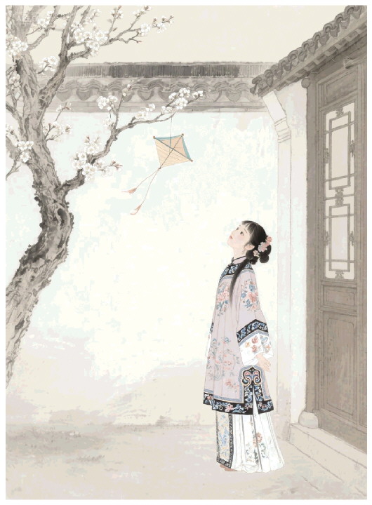 那天,小姐正独自在台阶下徘徊着,小弟拿着另一只风筝走进来:“大姐,咱们后花园里又落下了一只断线的风筝。”她心头一紧,差点叫出声来。风筝上画的是一株梧桐、一弯秋月,上面题写了古人的诗句:“碧落方秋静,腾空力尚微。清风如可托,终共白云飞。”她一下把风筝紧贴在心窝上,羞红了脸。说媒的人第二天就到了,未来的夫婿正是放风筝的那位少年书生。