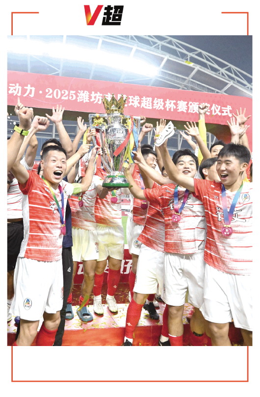 9月13日晚,奎文队队员在颁奖仪式上高举冠军奖杯。当日,“好运山东 悦动潍坊”——潍柴动力·2025潍坊市足球超级杯赛(简称“V超”)决赛暨闭幕式在潍坊奥体公园体育场举行。经过激烈角逐,最终奎文队以2∶1战胜坊子队,斩获赛事冠军。 本报记者 王晓光