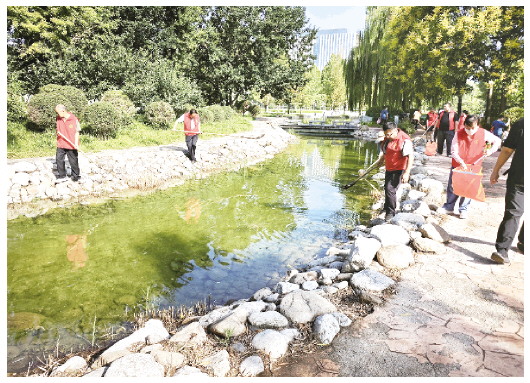 志愿者在昌乐市民文化体育公园打捞水中的垃圾。