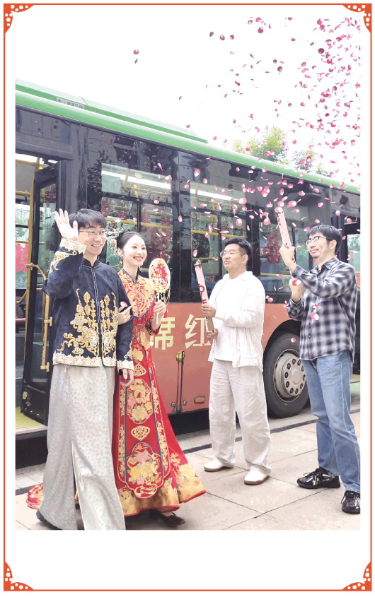 9月23日,“90后”新人牟荣宝(左一)与王晓玮走下公交车,亲朋好友拉响礼花筒祝贺。当天,寿光市孙家集街道范于村的村间道路上,一辆装扮喜庆的公交车缓缓行驶,成为一道亮眼的风景线。这辆公交车并非普通客运车辆,而是两位新人的“专属婚车”。新人和亲友同乘一车,打破传统的迎亲方式,不仅省下了不少开支,更将简约、环保的文明新风融入婚礼。 本报记者 隋炜凤