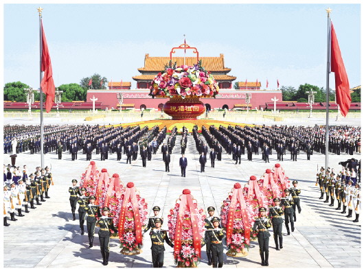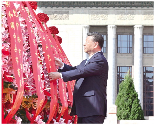 烈士纪念日向人民英雄敬献花篮仪式9月30日上午在北京天安门广场隆重举行。党和国家领导人习近平、李强、赵乐际、王沪宁、蔡奇、丁薛祥、李希、韩正等,同各界代表一起出席仪式。 上图:习近平整理花篮上的缎带。 下图:党和国家领导人来到北京天安门广场,出席烈士纪念日向人民英雄敬献花篮仪式。 新华社发