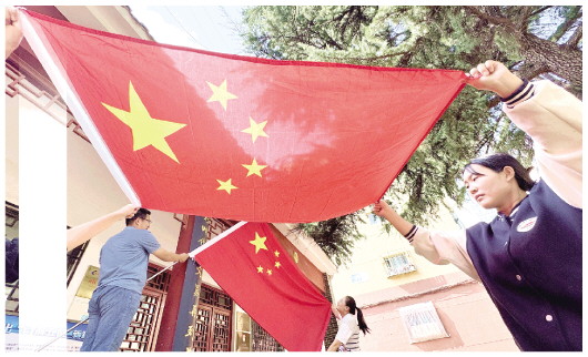 9月29日,记者在城区采访时看到,无论是繁华的商业街区,还是居民社区,都挂起了鲜艳的五星红旗,营造出喜迎国庆的浓厚氛围。图为奎文区东关街道奎文门社区的居民正在悬挂国旗。 本报记者 张驰