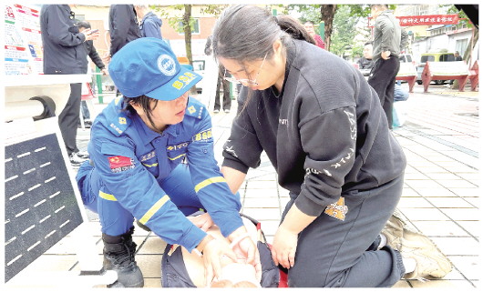 奎文区蓝天应急救援队成员为群众讲解应急救护技能。