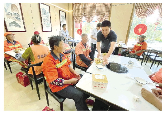 当天中午时分,环卫工人结束一上午的辛勤工作,陆续来到位于云门山南路的一家爱心饭庄,饭庄负责人丁敬早已为他们准备了丰盛的午餐(上图),大家围坐在一起,品尝着美味佳肴,脸上洋溢着幸福的笑容。热腾腾的饭菜、温馨的就餐环境,让这些平日里默默付出的“城市美容师”感受到家的温暖。饭后,丁敬还为环卫工人送上糕点礼盒。