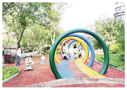 童乐园占地面积约1500平方米,以彩色透水混凝土铺装划分为红、黄、蓝区域,园内设有秋千、平衡木、跷跷板等游乐设施,能满足不同年龄段孩童的玩耍需求。同时,公园还融入“孔融让梨”“凿壁借光”“仓颉造字”等情景雕塑,将中华文化浸入儿童心中,帮助儿童在自然、友好的空间中快乐成长,将对儿童友好的愿景变成市民身边的“实景”。