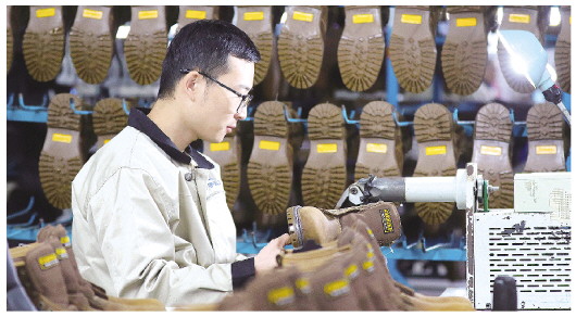 10月20日,工人在山东省高密市海宇股份有限公司加工安防鞋。 新华社发