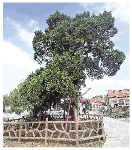 记者近日实地探访了这棵古树(上图),树高17米、胸径1.1米、冠幅约12米,在主干两米处分生三大主枝,一枝直立向上,另两枝状若巨人张开双臂“笑迎八方来客”。从南面看树冠分两层,上面一层由九条分枝组成,从北面看有三条分枝突兀其上,直冲苍穹。枝枝交错,有的屈曲盘绕,有的豪放舒展,千姿百态。每当日薄西山,余光横照,紫翠重叠。