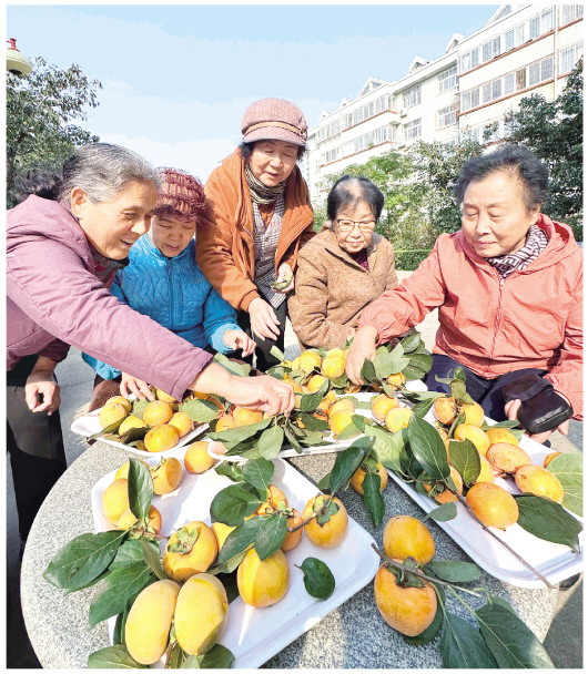 10月28日,在奎文区东关街道民生街社区,老人们正在分享收获的柿子。当日,该社区开展了一场“采摘丰收贺重阳”活动,社区内栽种的10多棵柿子树喜获丰收,金灿灿的柿子挂满枝头,社区志愿者陪同老人采摘硕果,现场到处充满着欢声笑语。 本报记者 张驰