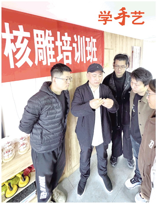 10月29日,在潍坊手造博物馆,潍坊核雕艺术家田洪波(左二)向爱好者展示核雕技艺。10月27日,潍坊市手造工匠人才专项培育计划正式启动,传统手工技艺培训班先行举办,设置烙画、传统风筝、核雕、蛋雕四项技艺培训。在潍坊市手造工匠人才专项培育计划——核雕培训班,30多名爱好者跟随田洪波学习核雕文化知识,体验核雕制作。 本报记者 张驰