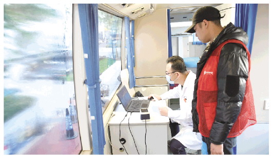 医护人员在移动体检车上为外卖配送员做胸部DR检查。