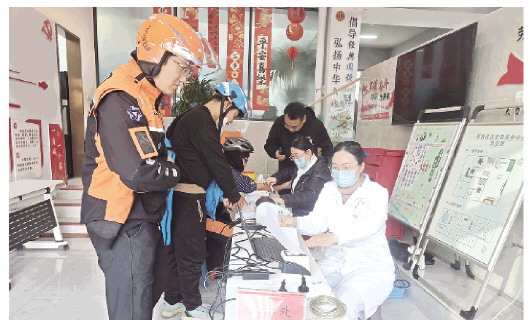 当天上午8时,医护人员早早到位,各项体检设备准备就绪。陆续抵达的外卖配送员在工作人员引导下有序排队、登记信息,现场忙碌而温馨。“平时跑单忙,长时间饮食、作息不规律,也总顾不上检查身体,这次体检直接送到‘家门口’,太方便了!”外卖骑手王刚笑着说。
