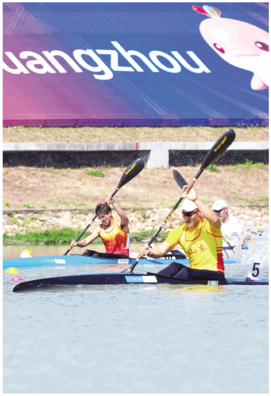 11月17日10时17分,第十五届全国运动会皮划艇静水项目男子1000米单人皮艇决赛在广东国际划船中心展开角逐。潍坊籍运动员张冬以3分31秒247的成绩冲线,拿下该项目金牌,这也是他继上届全运会后再次在这个项目站上最高领奖台,实现该项目全运会三连冠。图为张冬(中)在比赛中。 新华社发